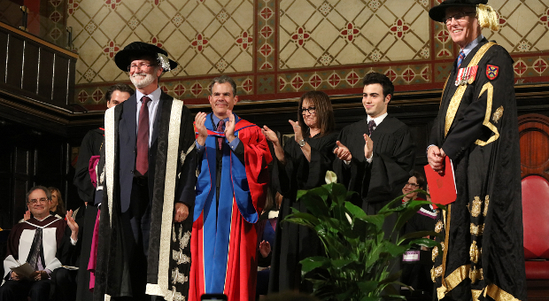 After the formal installation concluded, there were two honorary degree presentations. John Borrows, Canada Research Chair in Indigenous Law at the University of Victoria Law School, received a doctor of laws in recognition of his work in the field of Indigenous legal scholarship. And Queen's Principal Emeritus Daniel Woolf, Artsci’80, received a doctor of laws for his scholarship in the field of history and his leadership in higher education.