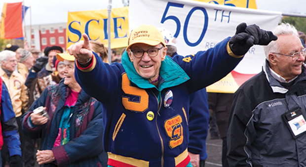 For many Tricolour Guard members, connecting with students is an important part of Homecoming weekend. Reunion Coordinator Ron Hodgson, Sc’62, says bonds form quickly between Gaels and it doesn’t matter how many decades apart they attended Queen’s. He loves it when the students cheer him and his classmates during the parade. "It’s a huge recognition. We (Tricolour Guard) love it and I think the students love it too,” Mr. Hodgson said.